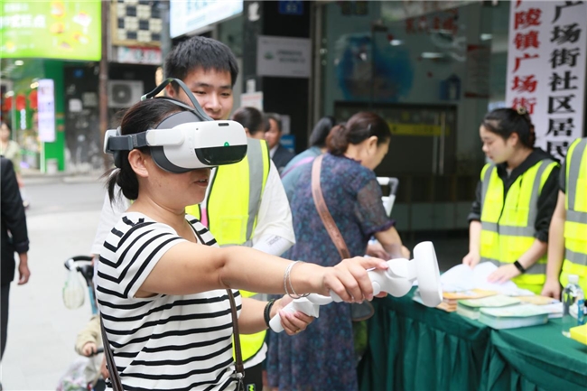 “我专门来了解心肺复苏怎么做的!”几名外卖骑手来到互动体验区,在专业老师指导下实操心肺复苏技能。现场设置了丰富多样的体验项目,吸引了居民们踊跃参与。触电体验模拟电工触电、家庭私拉乱接触电场景,让居民深刻认识到规范用电的重要性。VR体验区利用全景设备,让居民沉浸式体验消防、建筑等场景中的事故过程,劳动防护用品展示区详细介绍了各种劳保用品的使用方法,参与者们在指导下进行穿戴与使用。通过各种沉浸式的互动,强化了居民自我防护的安全意识,提升了应急急救能力。
